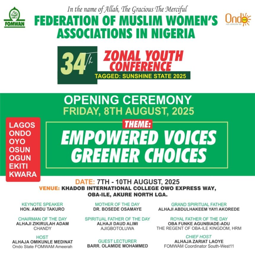 The Ondo State chapter of the Federation of Muslim Women’s Associations in Nigeria (FOMWAN) is set to host the 34th edition of its Zonal Youth Camp from 7th to 10th August 2025 at Khadob International College, located along Owo Express Road in Oba-Ile, Akure North Local Government Area.